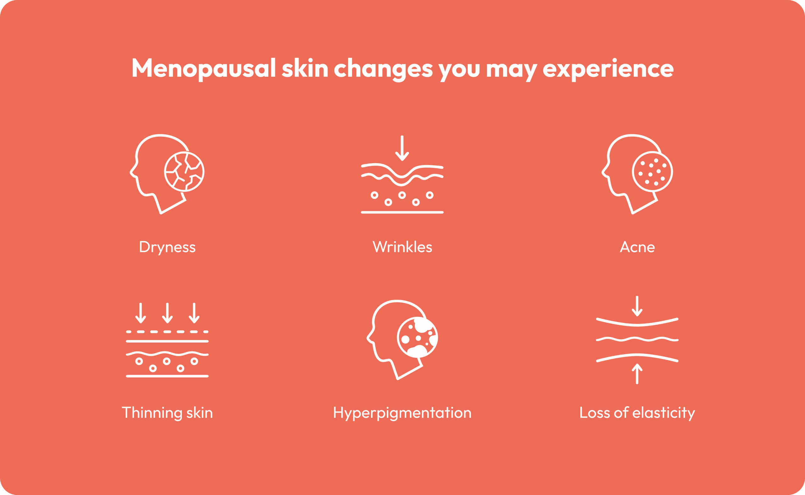 As estrogen begins to fluctuate and eventually decrease, your skin’s structure and function shift. This can lead to: