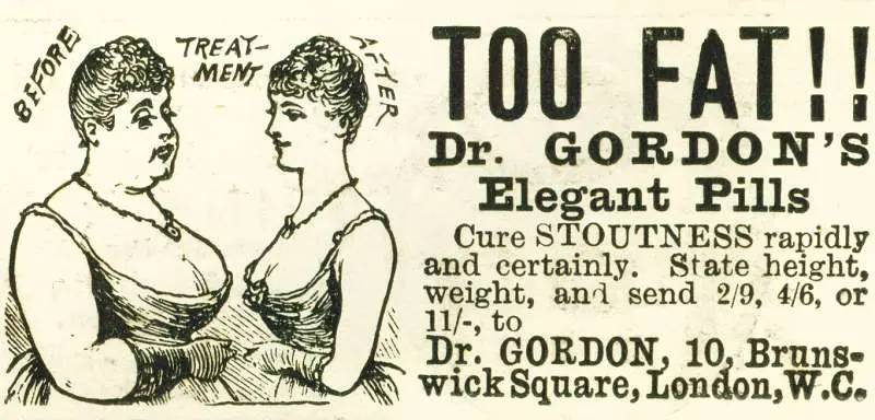 By the Victorian era, slimming pills had become widespread, containing alarming ingredients like arsenic, strychnine, soap, lard, and thyroid extract, sold under names like “Dr. Gordon’s Elegant Pills.” These dangerous compounds were marketed as miracle solutions with little oversight or regulation.